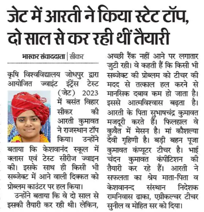 मैं आरती कुमावत पुत्री सुभाश चन्द कुमावत बसन्त बिहार सीकर में रहती हूॅ मैं पिछले दो वर्शो से स्वामी केशवानन्द शिक्षण संस्थान जेट एग्रीकल्चर टारगेट बेच से जुडी हुई थी पिछले वर्श में यहॉ की रेगुलर छात्रा थी लेकिन मैं अच्छी रैंक नहीं ले पाई इस वर्श केशवानन्द संस्थान की जेट ऑनलाईन क्लास एव टेस्ट सीरिज के साथ प्रोब्लम कांउटर के साथ कठोर मेहनत की इसका परिणाम यह रहा कि मैने पुरे राजस्थान में जेट परीक्षा में प्रथम रैंक प्राप्त की। मैं मेरी सफलता का श्रेय अपने माता पिता एवं केशवानन्द संस्थन के निदेशक रामनिवास ढाका एवं एग्रीकल्चर विषय के अध्यापक सुनील सर, मोहित सर को देना चाहती हूॅ जिन्होने हर वक्त मेरा साथ दिया। मै जेट की तैयारी करने वाले सभी प्रतिभागीयों से यही कहना चाहती हॅ कि ईस्ट और वेस्ट केशवानन्द इज बेस्ट।