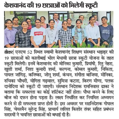 सीकर। एनएच 52 स्थित स्वामी केशवानन्द शिक्षण संस्थान भढाडर सीकर की 19 छात्राओं को कालीबाई भील मेधावी छात्रा स्कूटी योजना के तहत स्कूटी आवंटित की गई। जिसमें केशवानन्द की मोनिका कुमारी, प्रियांषी, रीतु नेहरा, खुशी शर्मा, निशा कुमारी शर्मा, कल्पना, कोमल कुमारी, निकिता, पायल जांगिड, कनिष्का, जोनू शर्मा, कंचन, संगीता बाजिया, मोनिका, रूचिका चौधरी, योगिता गढवाल, सुमित्रा कटारा, किरण मीणा, पलक दानोदिया को स्कुटी दी जायेगी। संस्थान निदेशक रामनिवास ढाका ने सम्बोधित करते हुए बताया कि सफलता का कोई शार्टकट नहीं होता, पौधा बनने के लिए बीज को दफन होना पडता है लक्ष्य निर्धारित कर नियमित अध्ययन करने से ही सफलता प्राप्त होती है। चयनित छात्राओं ने अपना लक्ष्य बनाकर कठोर मेहनत के दम पर सफलता को प्राप्त किया है। इस अवसर पर सहनिदेशक गोपाल सिंह, चैयरमेन सुरेन्द्र सिंह, प्राचार्य ललित किशोर तंवर, सहित प्रबंधन सदस्यों ने चयनित छात्राओं को बधाई प्रेषित की।