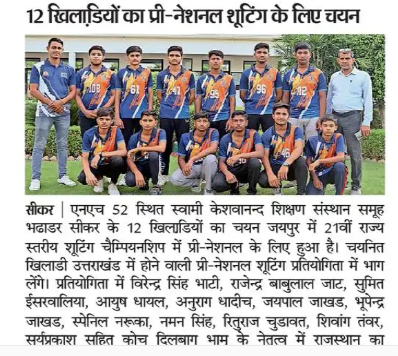 सीकर। एनएच 52 स्थित स्वामी केशवानन्द शिक्षण संस्थान समूह भढाडर सीकर के 12 खिलाडियों का चयन जयपुर में आयोजित 21वीं राज्यस्तरीय शूटिंग चैम्पियनशिप में प्री-नेशनल के लिए किया गया है। ये चयनित खिलाडी उतराखंड में आयोजित होने वाली प्री-नेशनल शूटिंग प्रतियोगिता में भाग लेगें। संस्थान के लिए यह बहुत ही गौरव की बात है कि इस प्रतियोगिता में राजस्थान की तरफ से प्रतिनिधित्व करने के लिए अकेले केशवानन्द से 12 खिलाडी है। जिनमें विरेन्द्र सिंह भाटी, राजेन्द्र बाबुलाल जाट, सुमित ईसरवालिया, आयुष धायल, अनुराग धादीच, जयपाल जाखड, भूपेन्द्र जाखड, स्पेनिल नरूका, नमन सिंह, रितुराज चुडावत, शिवांग तंवर, सुर्यप्रकाश सहित कोच दिलबाग भामू के नेतृत्व इस प्रतियेगिता में राजस्थान का प्रतिनिधित्व करेगें। इस अवसर पर संस्थान निदेशक रामनिवास ढाका, सहनिदेशक गोपाल सिंह, चैयरमैन सुरेन्द्र सिंह सहित प्रबंधन सदस्यों ने चयनित खिलाडियों को बधाई प्रेषित की।