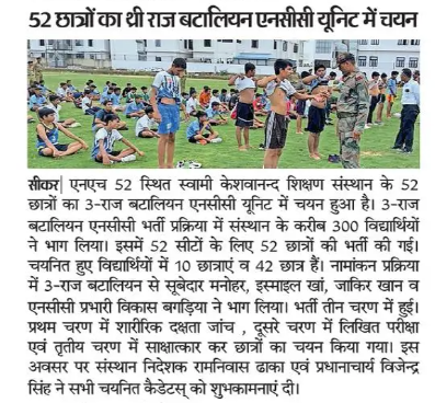 सीकर। एनएच 52 स्थित स्वामी केशवानन्द शिक्षण संस्थान में 3-राज बटालियन एनसीसी यूनिट में 52 छात्रों का चयन हुआ है। 3-राज बटालियन एनसीसी भर्ती प्रक्रिया में संस्थान के लगभग 300 छात्रों ने भाग लिया जिसमें 52 सीटों के लिए 52 छात्रों को भर्ती की गई। जिसमें 10 लडकियों एवं 42 लडकों का चयन किया। नामांकन प्रक्रिया 3-राज बटालियन से सुबेदार मनोहर व इस्माइल खां और जाकिर खान एवं संस्थान एनसीसी प्रभारी विकास बगडिया ने भाग लिया एवं भर्ती के लिए 3 चरण आयोजित किये जिसमें प्रथम चरण में छात्रों की शारीरिक दक्षता की जांच की दूसरे चरण में लिखित परीखा एवं तृतीय चरण में साक्षात्कार आयोजित कर छात्रों का चयन किया गया। इस अवसर पर संस्थान निदेशक रामनिवास ढाका एवं प्रधानाचार्य विजेन्द्र सिंह ने सभी चयनित कैडेटस् को शुभकामनाएॅ दी।
