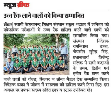 सीकर। एनएच 52 स्थित स्वामी केशवानन्द शिक्षण संस्थान स्कूल भढाडर में एकेडमिक परीक्षाओं में उच्च रैंक हासिल करने वाले विद्यार्थियों को सम्मानित किया गया। सम्मान समारोह में संस्थान निदेशक रामनिवास ढाका, चेयरमैन सुरेन्द्र सिंह, प्रधानाचार्य विजेन्द्र मलिक सहित विषयाध्यापकों ने सभी कक्षाओं के प्रथम, द्वितीय एवं तृतीय रैंक प्राप्त करने वाले विद्यार्थियों को क्रमशः गोल्ड, सिल्वर व ब्रोंज मैडल पहनाकर सम्मानित किया। जिसमें कक्षा 9 से 12 के दिव्या ढाका, कुमारी रीकि, रूखसार बानो, प्रियांशी, लक्की महला, कल्पना शर्मा, भारती, मनिषा रानी, उषा मातवा, पियुष चौधरी, प्रशांत दानोदिया, कल्पना गुर्जर, समीर राणा ने गोल्ड मैडल हासिल किये। वहीं अंकित कुमार, अनीशा बानो, अक्षिता, ममता भूरिया, मिताली पिलानिया, सुरेन्द्र बिश्नोई, मीना कुमारी, राजेन्द्र सियाग, रौनक जांगिड, प्रदीप रणवा, साल्वी भास्कर, महिमा ने सिल्वर मैडल हासिल किया व कनिष्का, अंकिता कृष्णिया, अनुप्रिया, दिनेश कडवासरा, रोहिताश बाना, महिमा, राजेन्द्र कविया, कुसुम कृष्णिया, पूजा थोरी, दिपिका, अरबाज खान, आदिज्य उपाध्याय, अमित बिनवाल ने ब्रोंज मैडल हासिल किया। संस्थान निदेशक रामनिवास ढाका ने बच्चों को सम्बोधित करते हुए बताया कि परिश्रम करने वाले विद्यार्थी ही जीवन में सफलता को हासिल कर सकते है चाहे वह शिक्षा हो या खेल। शिक्षा के साथ साथ खेल भी विद्यार्थी के लिए आवश्यक होता है। जिससे विद्यार्थी का बौद्धिक एवं शारीरिक विकास होता है। इस अवसर पर प्रबंधन सदस्यो सहित सभी विद्यार्थी एवं स्टाफ उपस्थित रहे।