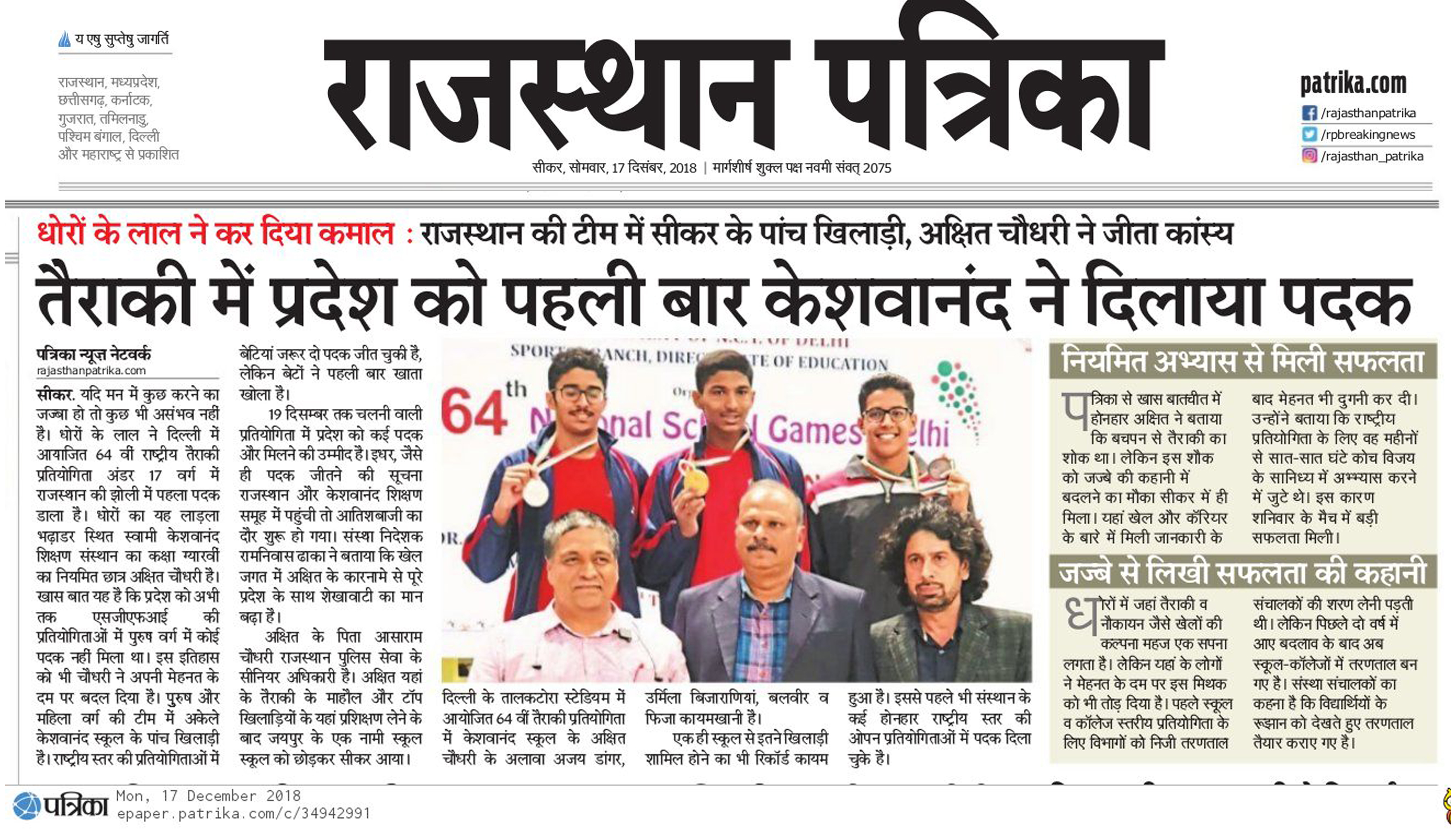 सीकर। एनएच 52 स्थित स्वामी केशवानन्द शिक्षण संस्थान के छात्र अक्षित चैधरी ने 64वीं विद्यालयी राष्ट्रीय तैराकी प्रतियोगिता जो कि दिल्ली के तालकटोरा स्टेडियम में दिनांक 13 दिसम्बर से 19 दिसम्बर तक आयोजित हो रही है में पुरूष वर्ग में ब्रांज मैडल हासिल किया। संस्था निदेशक रामनिवास ढाका ने बताया कि एसजीएफआई गेम्स के पुरूष वर्ग में राजस्थान के इतिहास में किसी भी स्विमिंग इंवेट में राजस्थान के लिए यह पहला मैडल है और यह मैडल केशवानन्द के छात्र अक्षित चैधरी ने प्राप्त किया है। इस राष्ट्रीय तैराकी प्रतियोगिता में राजस्थान के कुल 19 प्रतियोगियों में से अकेली केशवानन्द स्कूल भढाडर के 5 छात्र राजस्थान का प्रतिनिधित्व कर रहे जो कि संस्थान के लिए बहुत ही गर्व की बात है।